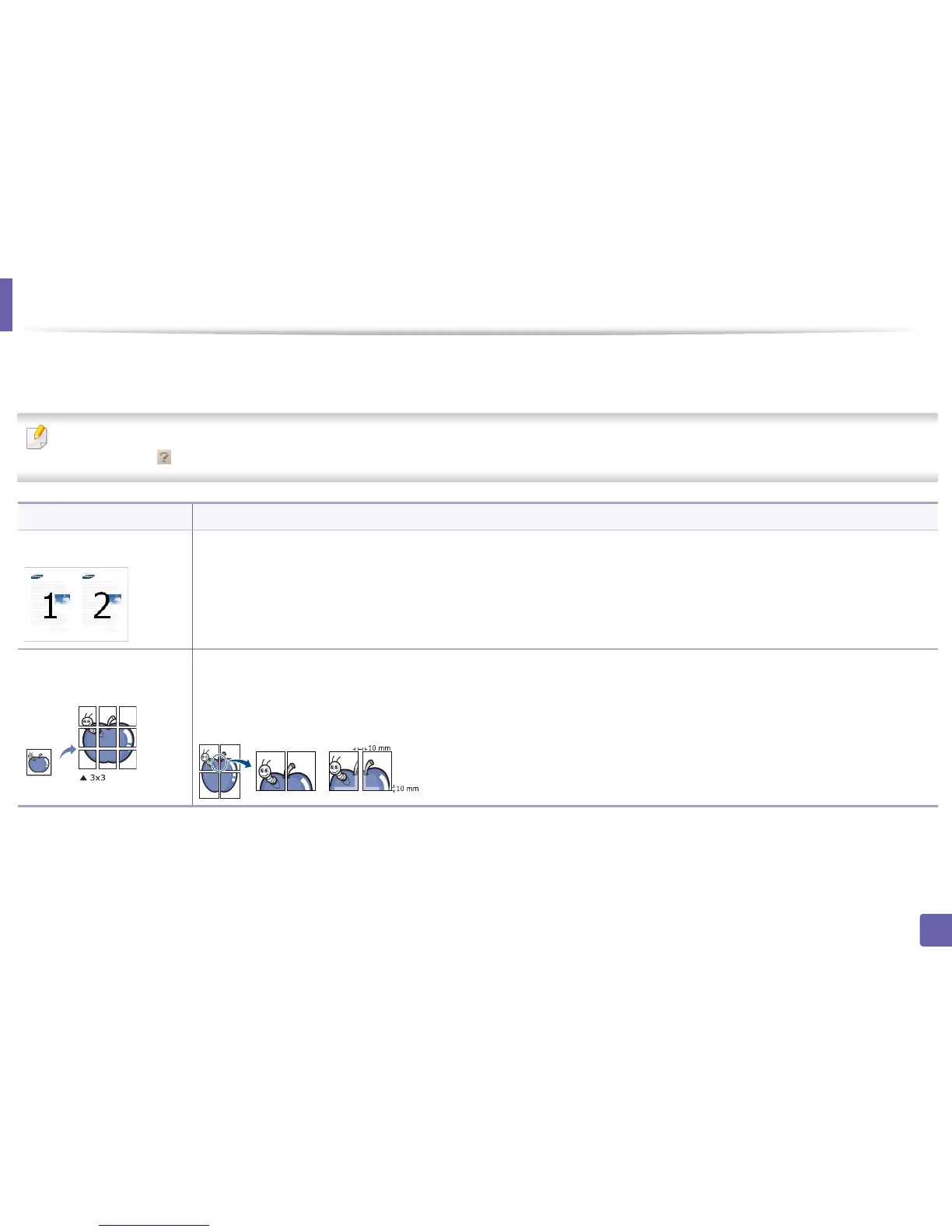 Prints a single-page document onto 4 (Poster 2x2), 9 (Poster 3x3), or 16 (Poster 4x4) sheets of paper, for the purpose of pasting the sheets