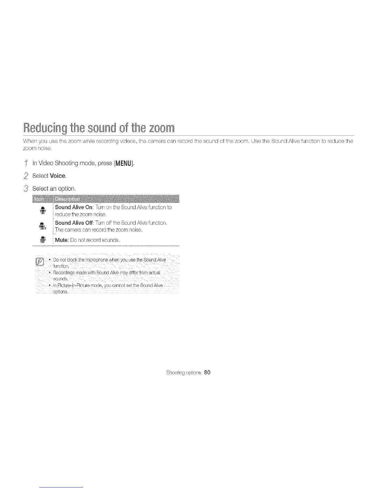 When you use the zoom while recording videos, the camera can record the sound of the zoom. Use the Sound Alive function to reduce the
