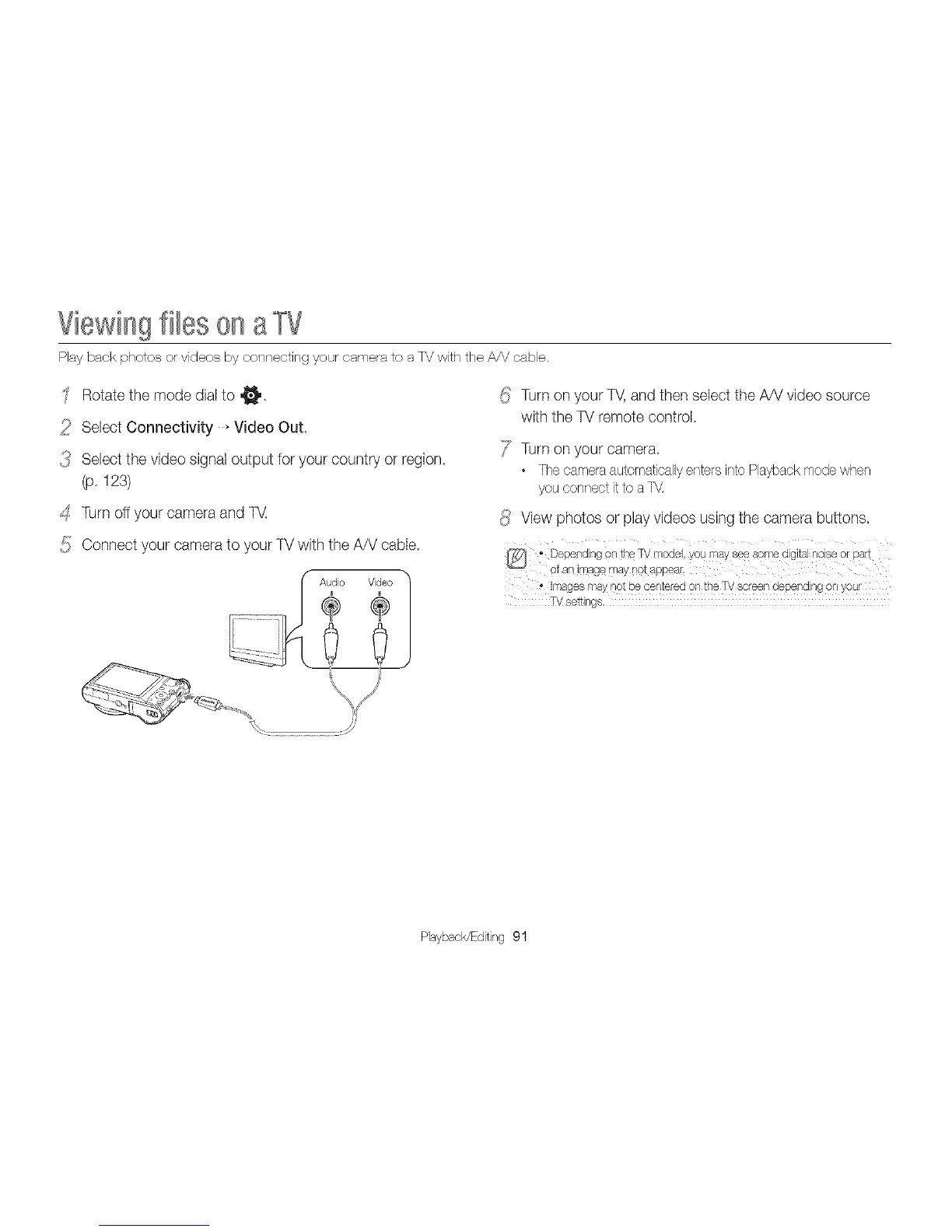 _!_ Connect your camera to your TVwith the A/V cable.