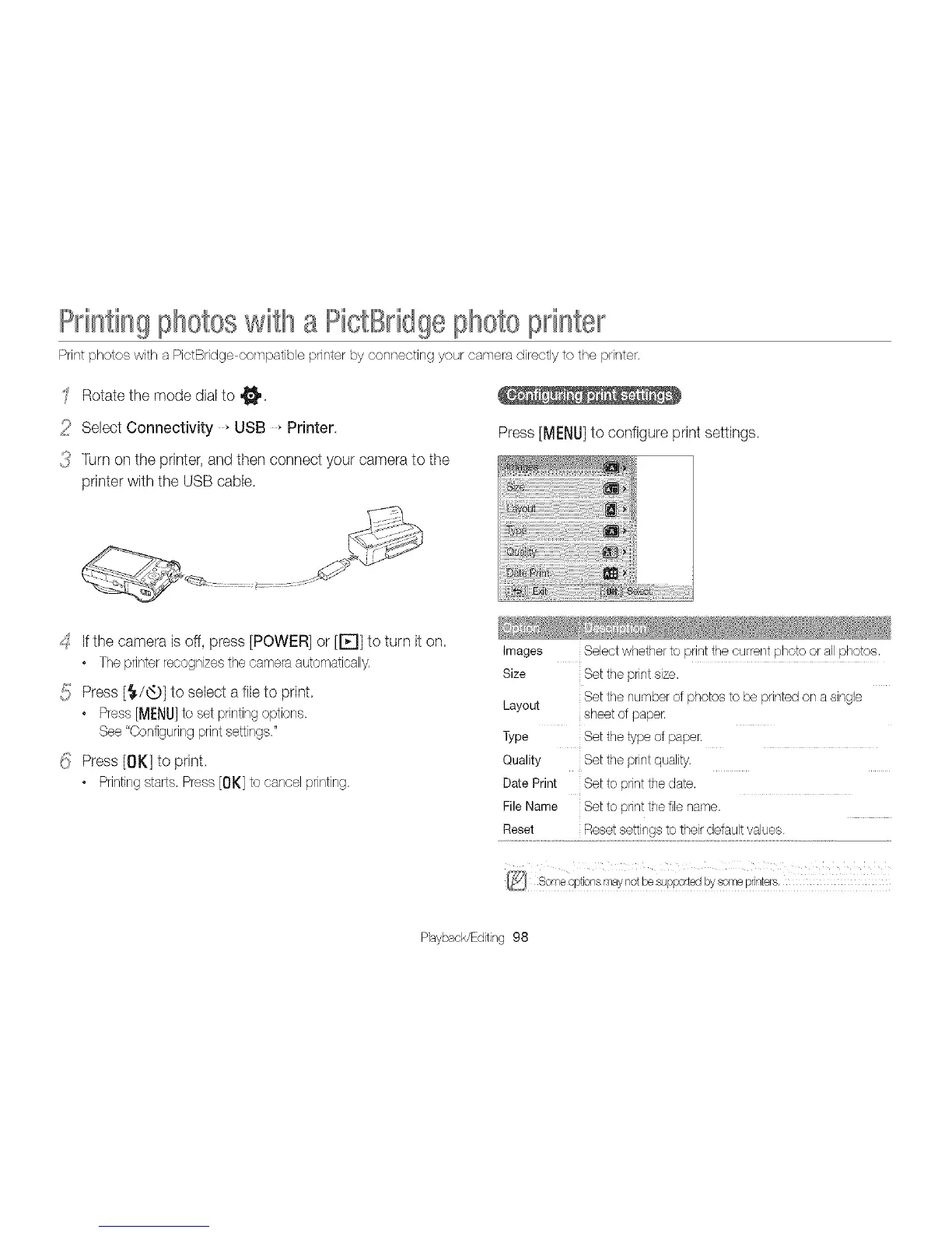 Print photos with a PictBndge compatible printer by connecting your camera directly to the printer.