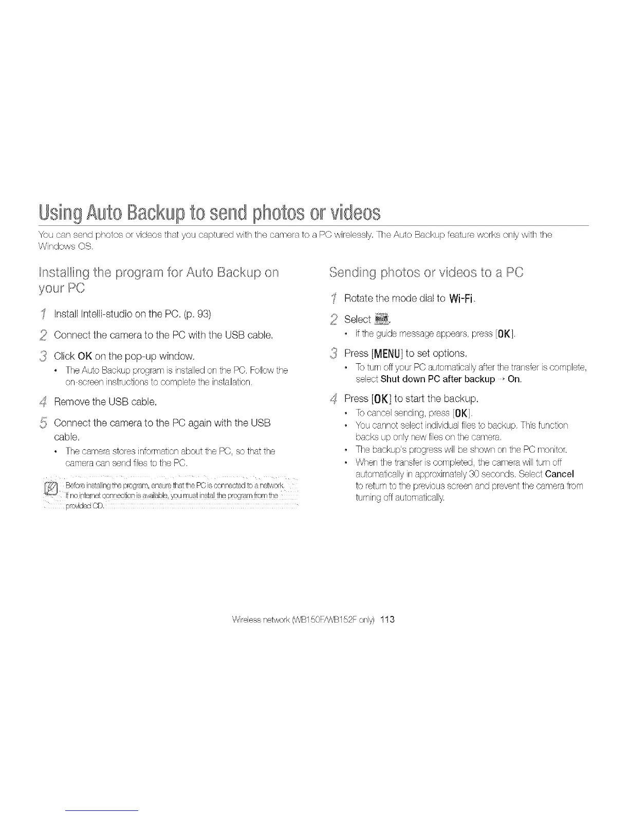 You can send photos or videos that you captured with the camera to a PC wirelessly, The Auto Backup feature works only with the
