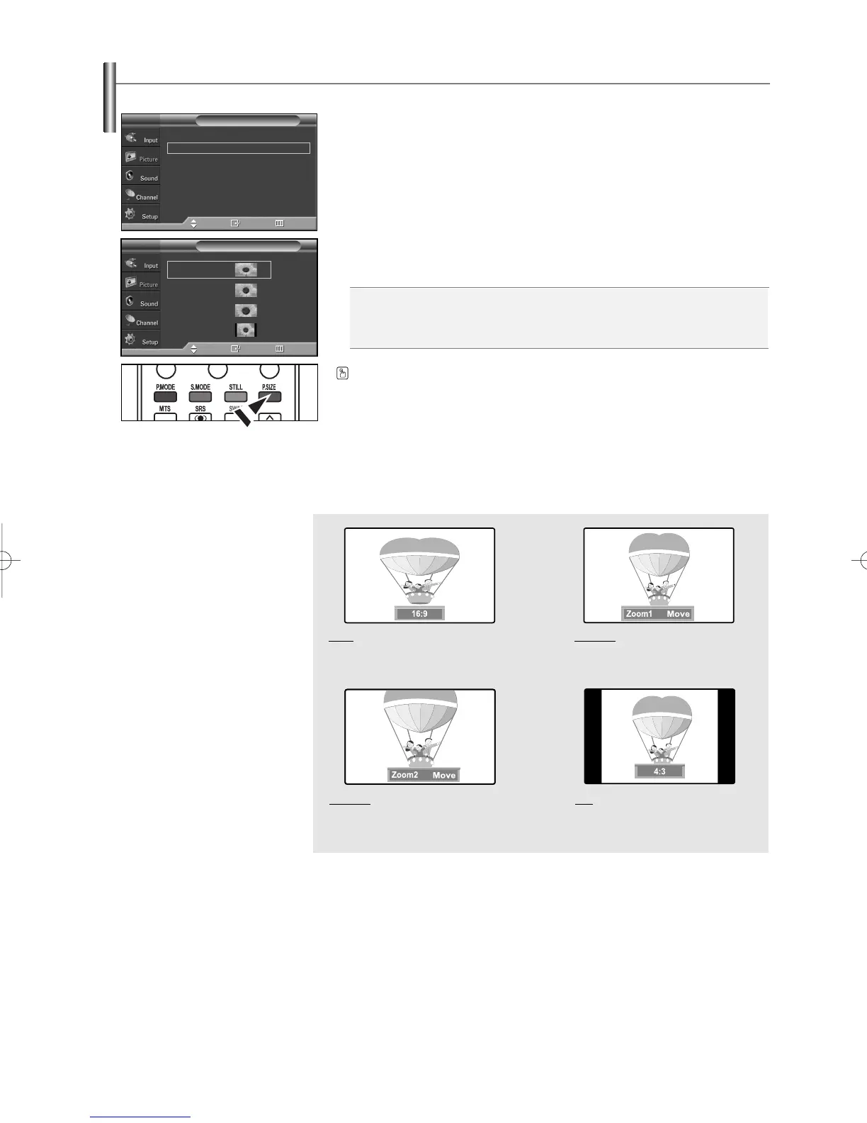 Press the P.SIZE button on the remote control to change the picture size.