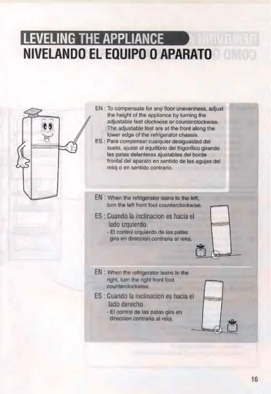Samsung SR-28 - LEVELING THE APPLIANCE; Adjust adjustable feet; Correct left lean; Correct right lean