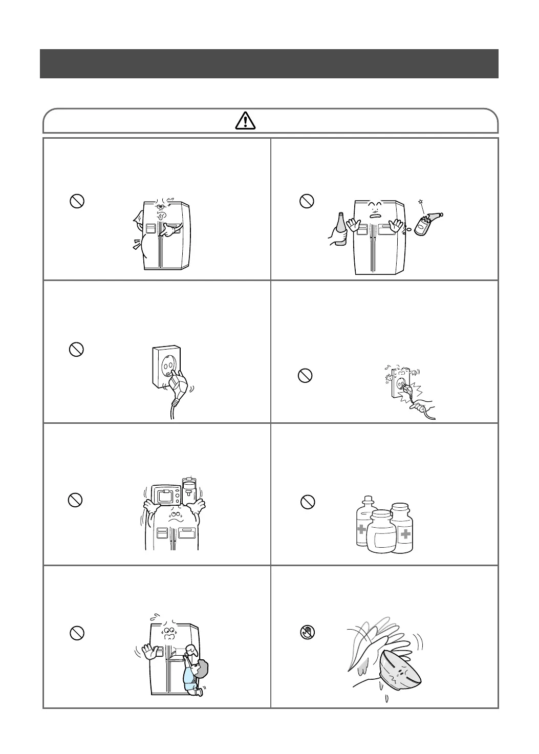 Do not let children hang from the door. Do not touch the inside freezer section walls,