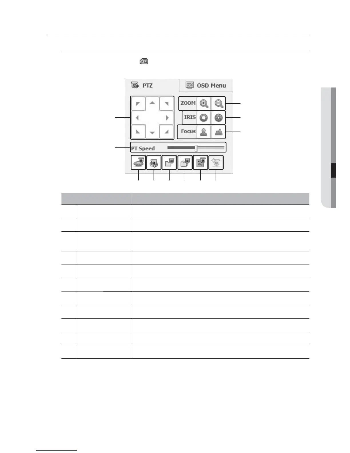 If PTZ camera is connected, the < > icon appears on screen. When selecting corresponding camera