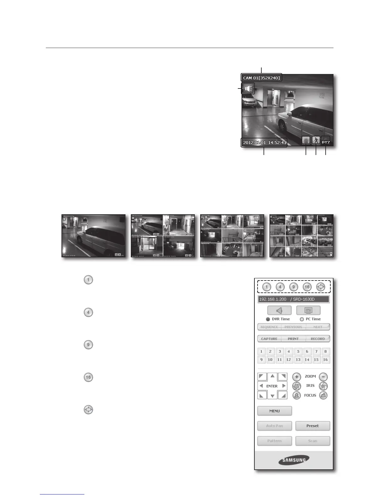 If you have set PTZ cameras for the DVR, “PTZ” is displayed on the