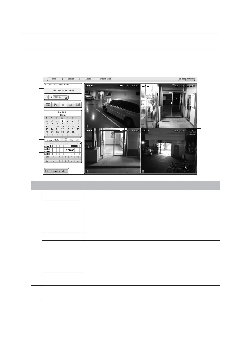 Displays the IP, model name, time, etc. of connected DVR.