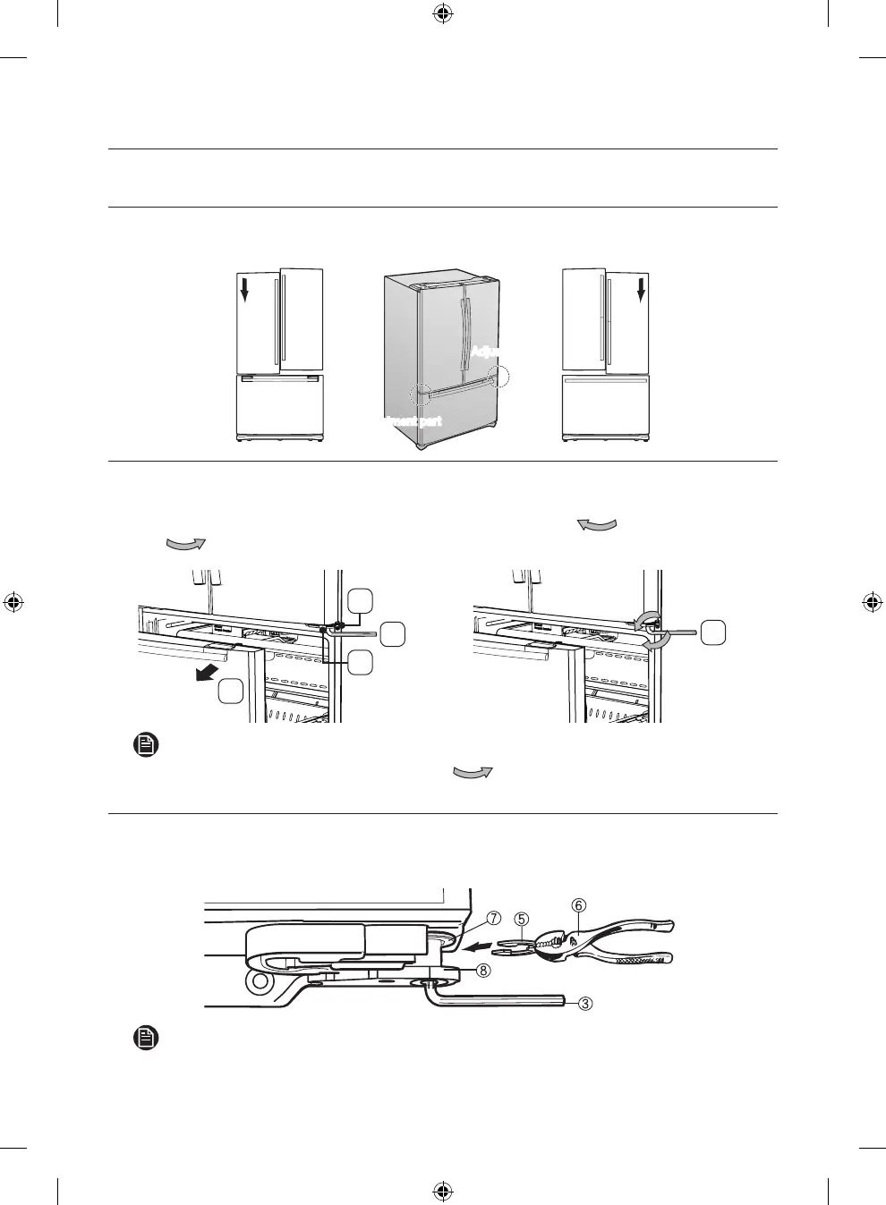 1. After adjusting the doors, please insert the supplied fastener ( 5 ) using Pliers ( 6 ) in the gap