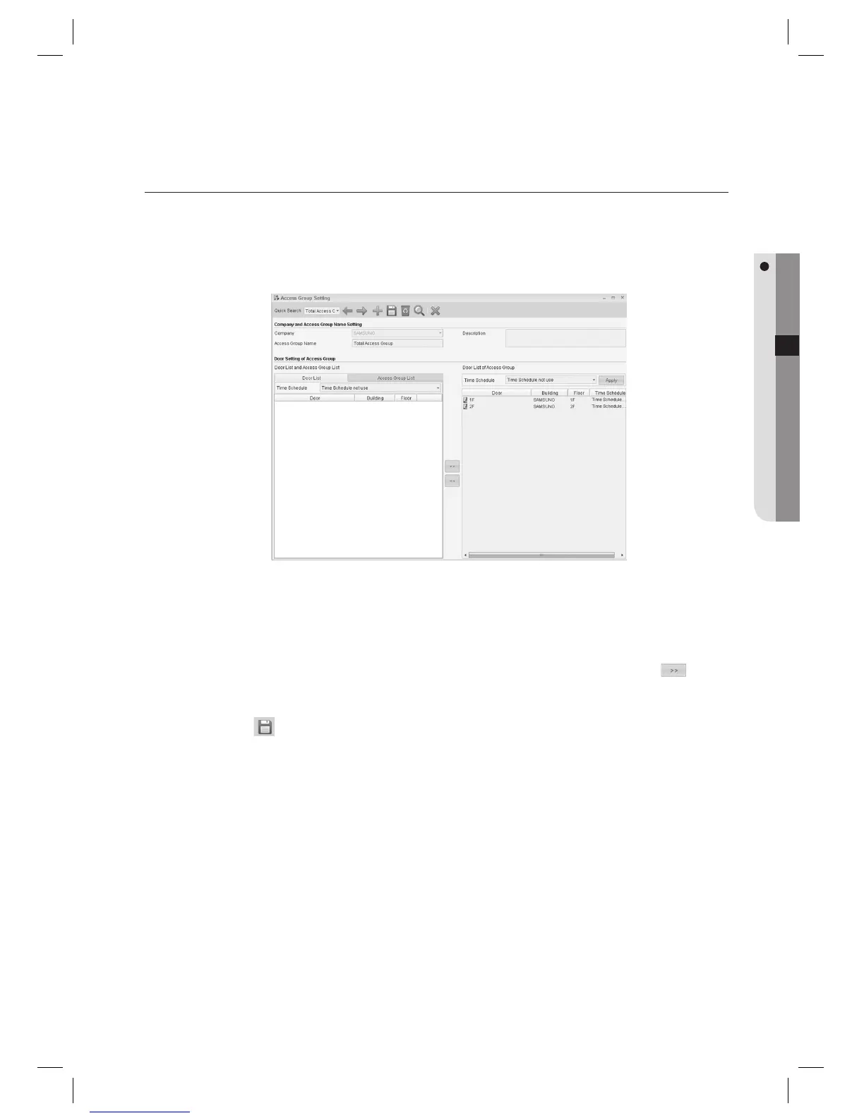 You can confi gure the time schedule of the access group for each door. Grouping multiple access groups is