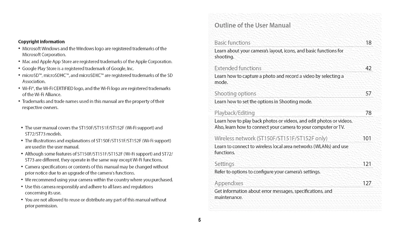 The user manual covers the ST150F/ST151F/ST152F(WI-FI support) and