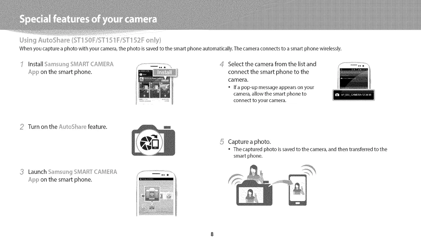When you capture a photo with your camera, the photo is saved to the smart phone automatically. The camera connects to a smart phone wirelessly.