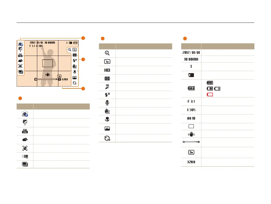 The icons the camera displays on the screen change according to the mode you select or the options you set.