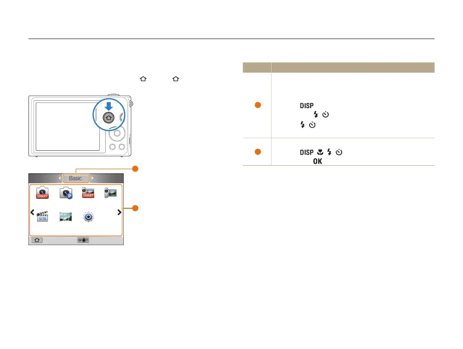 You can select a shooting mode or access the settings menu by selecting the icons on the Home screen.