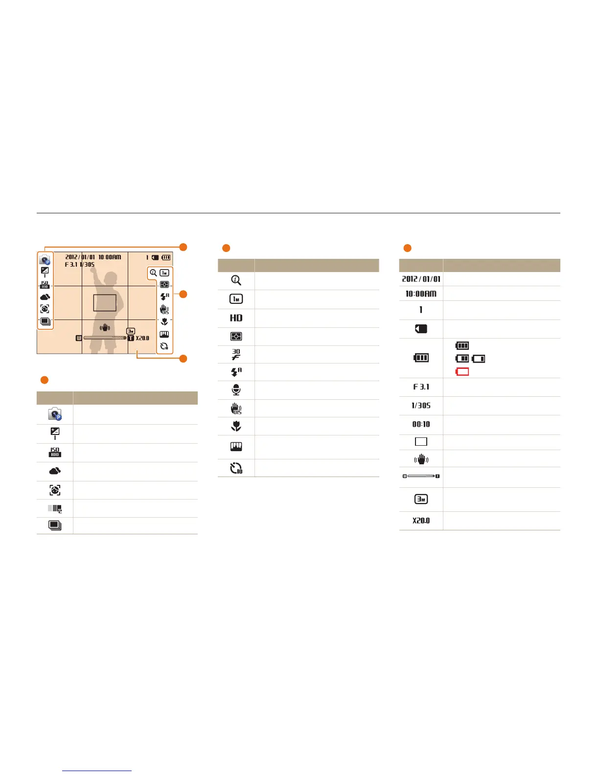 The icons the camera displays on the screen change according to the mode you select or the options you set.
