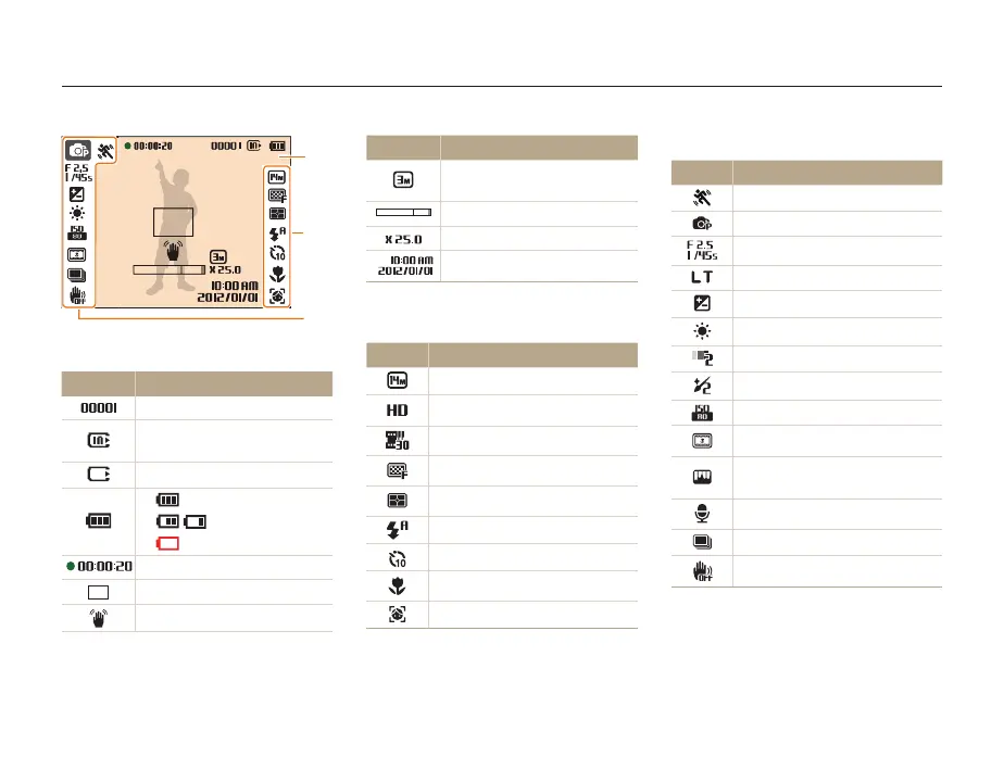 The icons the camera displays on the screen change according to the mode you select or the options you set.