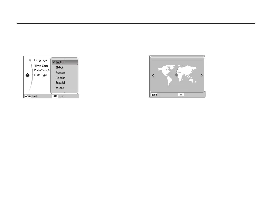 When you turn on your camera for the first time, the initial setup screen appears. Follow the steps below to configure the camera’s basic