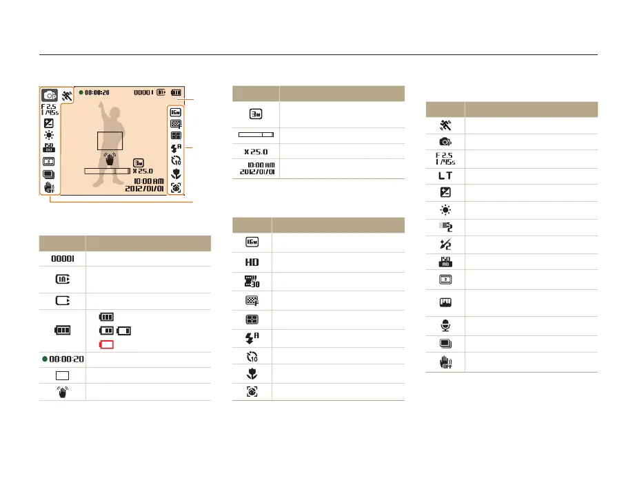 The icons the camera displays on the screen change according to the mode you select or the options you set.