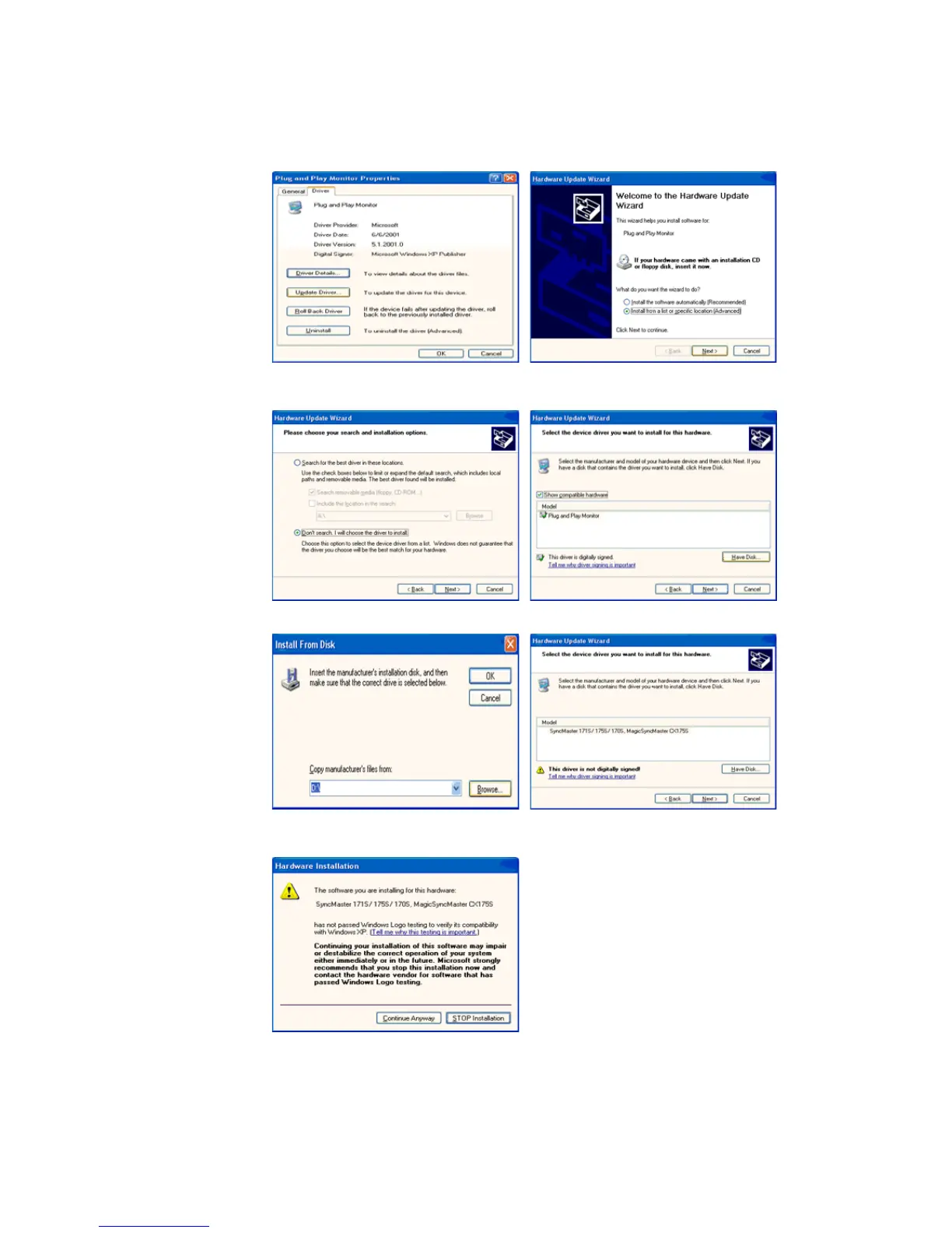 7. Pulse el botón “Examinar” luego escoja el A:\(D:\driver) y seleccione el modelo de su monitor