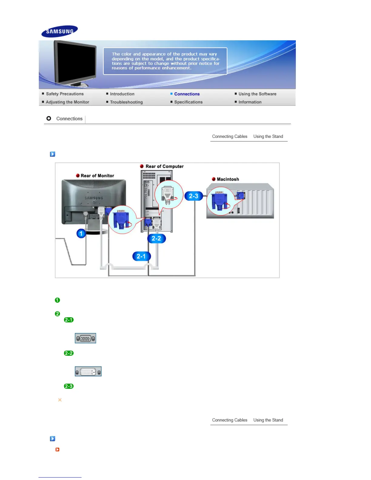 -Connect the monitor to the Macintosh computer using the D-sub connection cable.