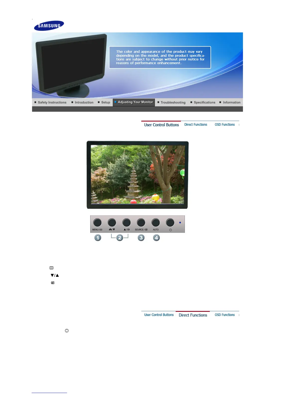 Opens the on-screen menu and exits from the menu or closes the adjustment menu.