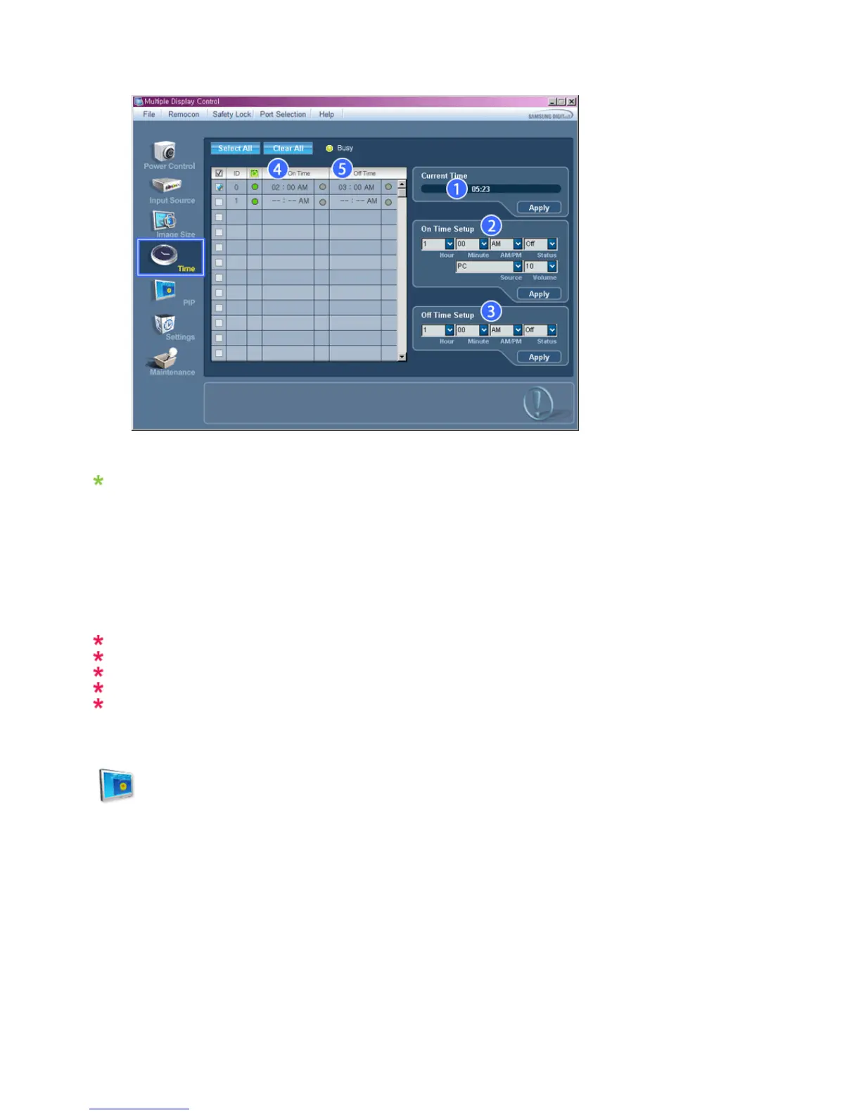 - Set the Hour, Minute, AM/PM of On Time Setup, Status, Source, Volume of the selected display.