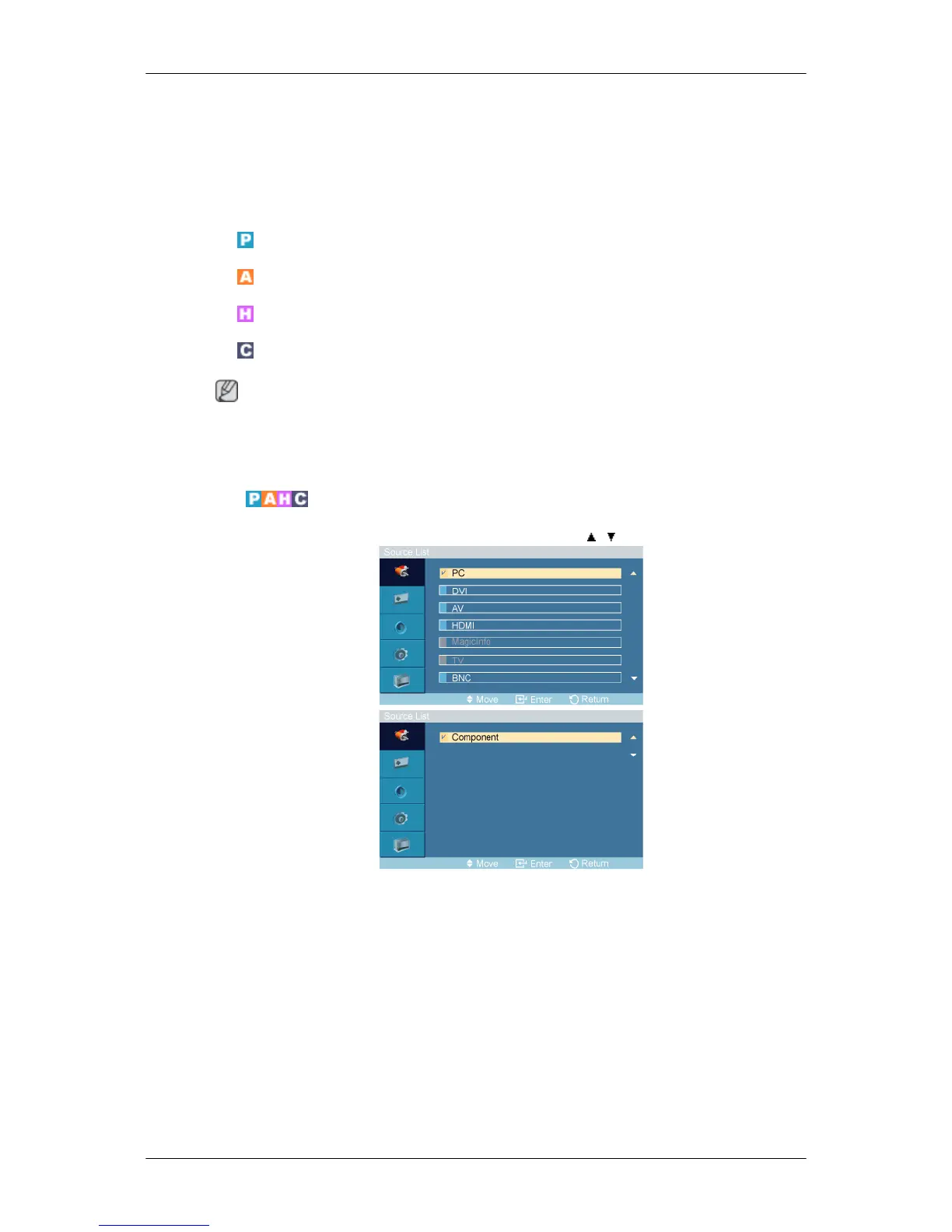 Use to select PC, DVI or other external input sources connected to the LCD Display. Use to select the