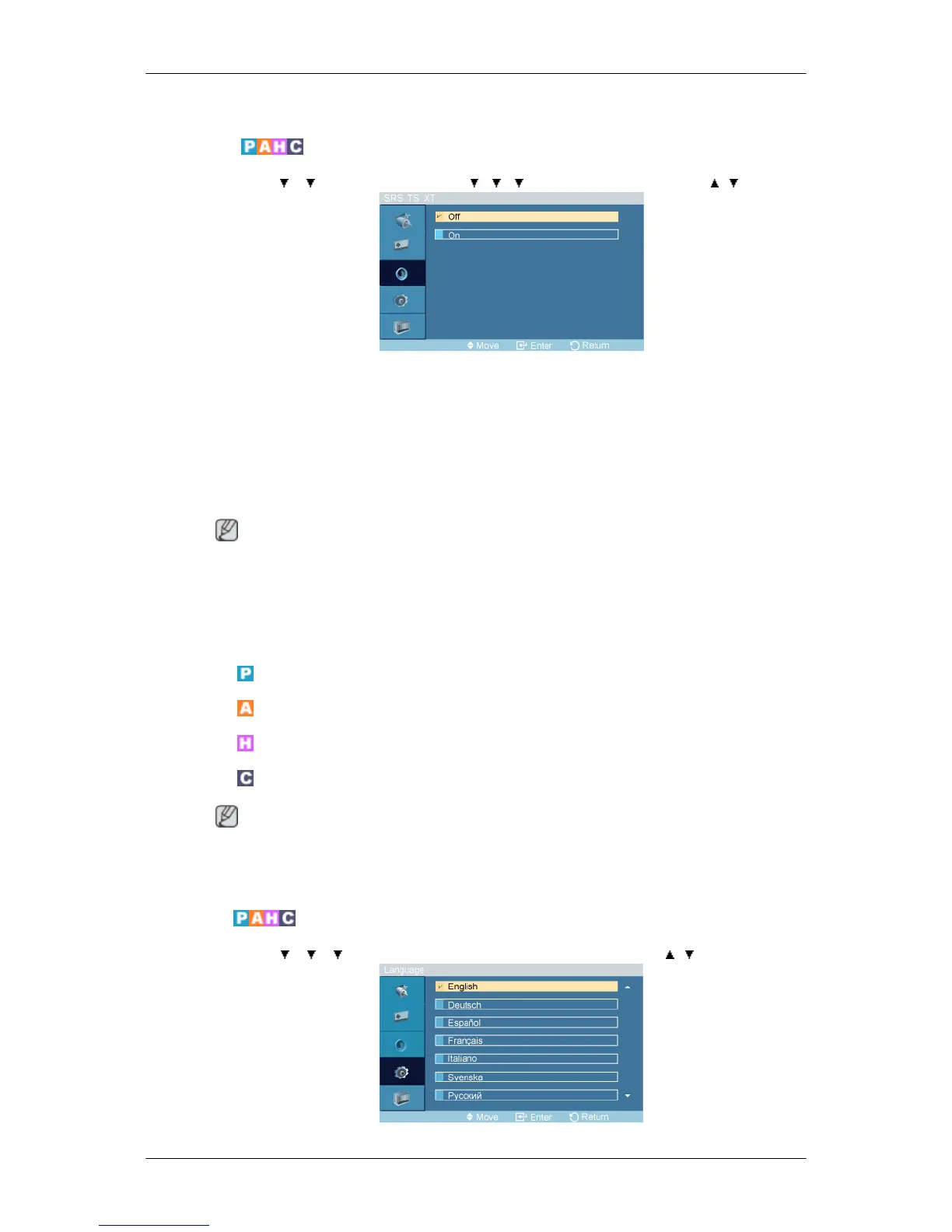 MENU → → → ENTER → [Sound] → → → → ENTER → [SRS TS XT] → , → ENTER