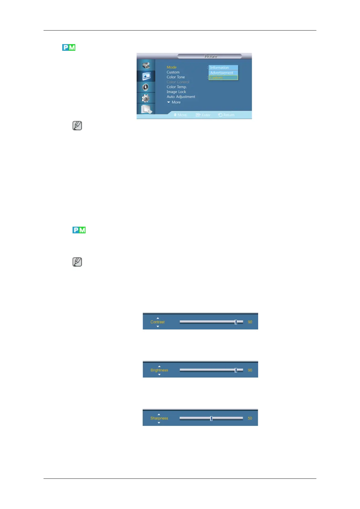 • By adjusting the picture using the Custom function, Mode will change to Custom mode.