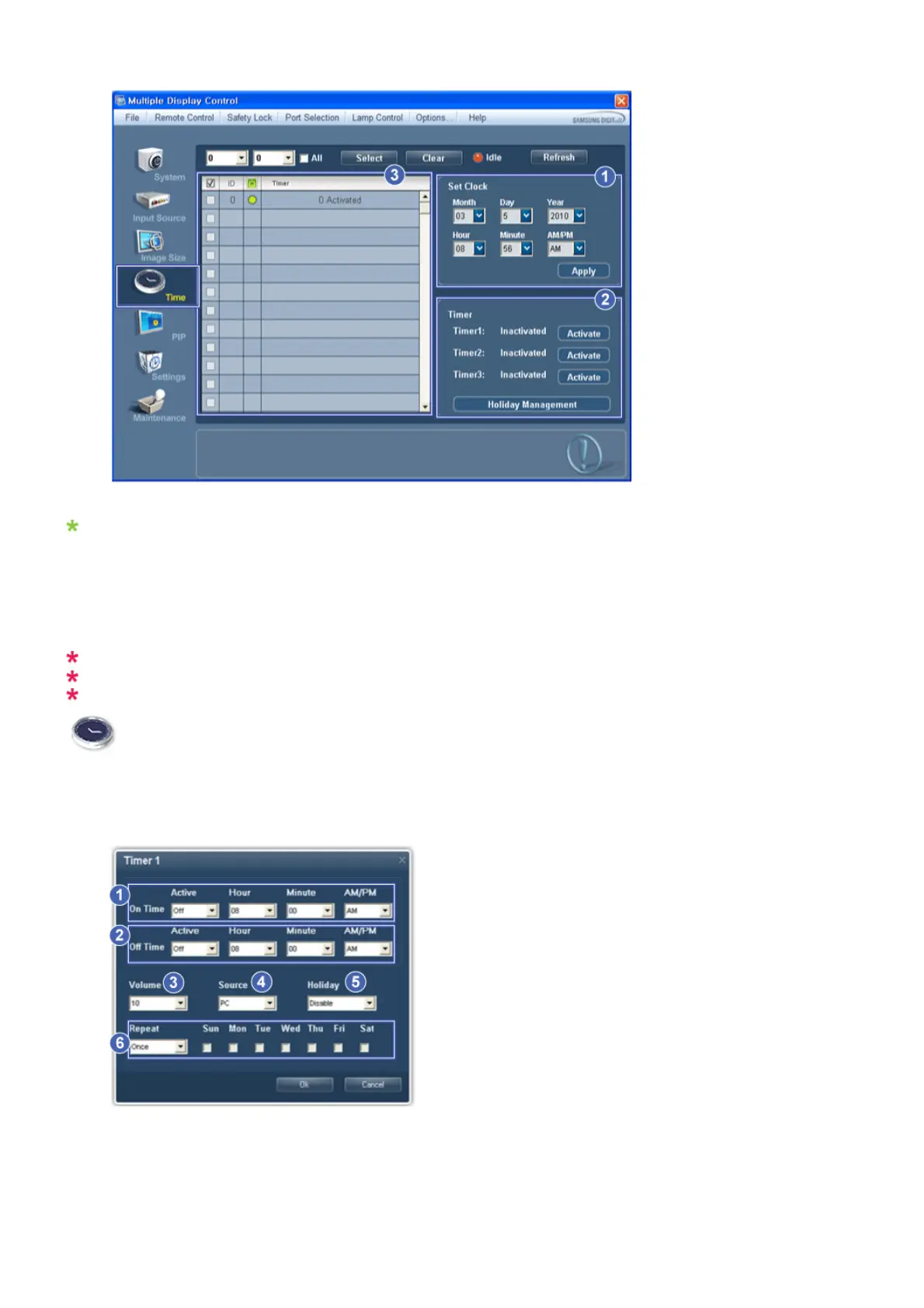 - Sets the time in hours, in minutes and as AM/PM for turning the selected monitor on.