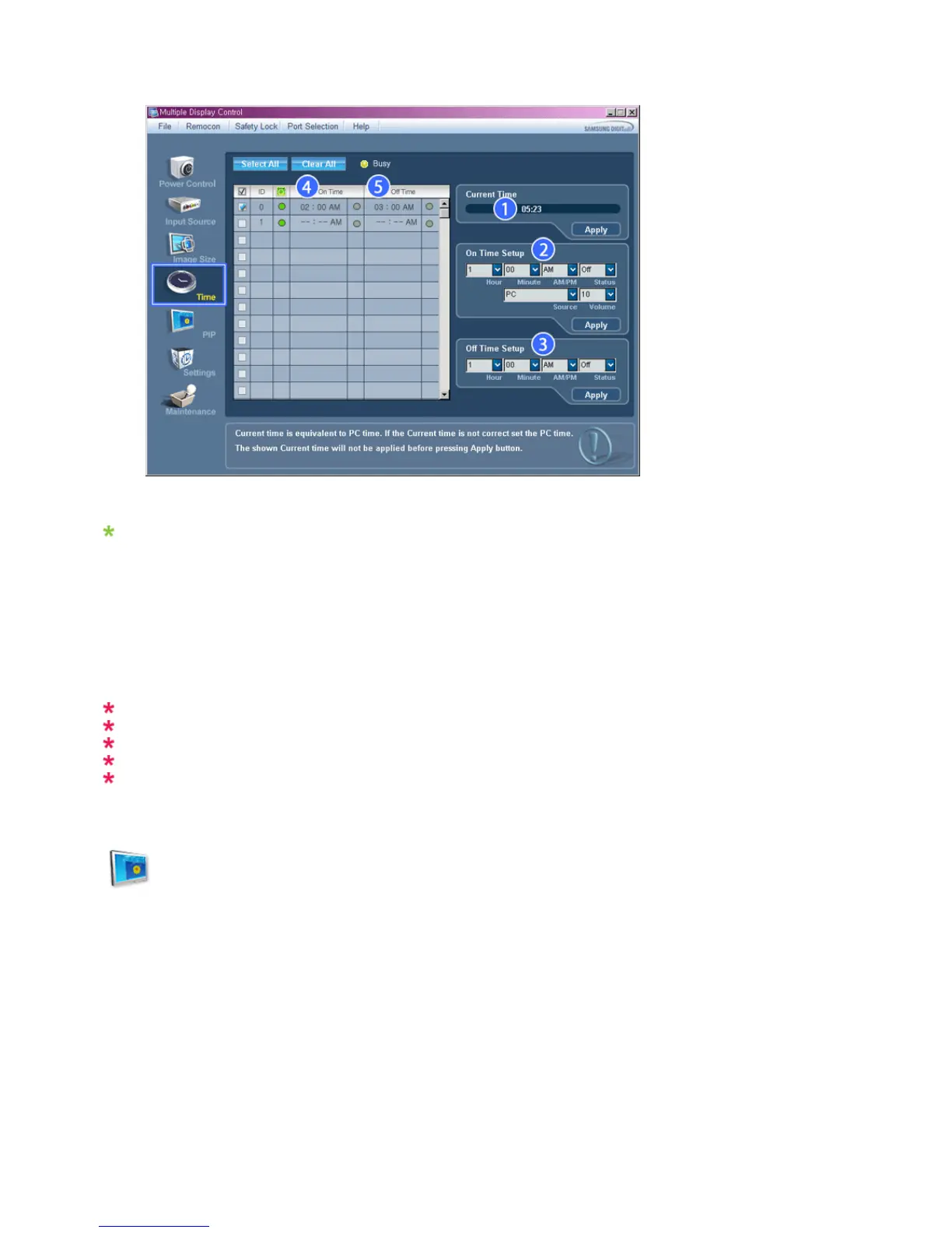 - Set the Hour, Minute, AM/PM of On Time Setup, Status, Source, Volume of the selected display.
