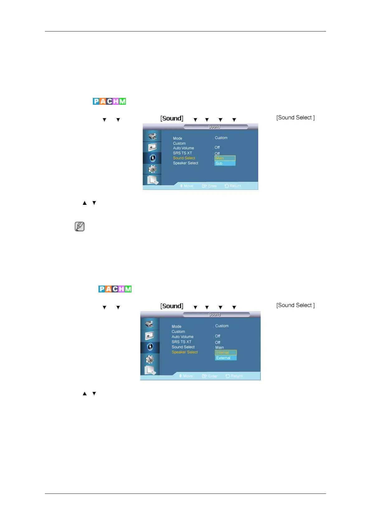 1. Internal : Sound is outputted both from the Internal speaker and the External speak-