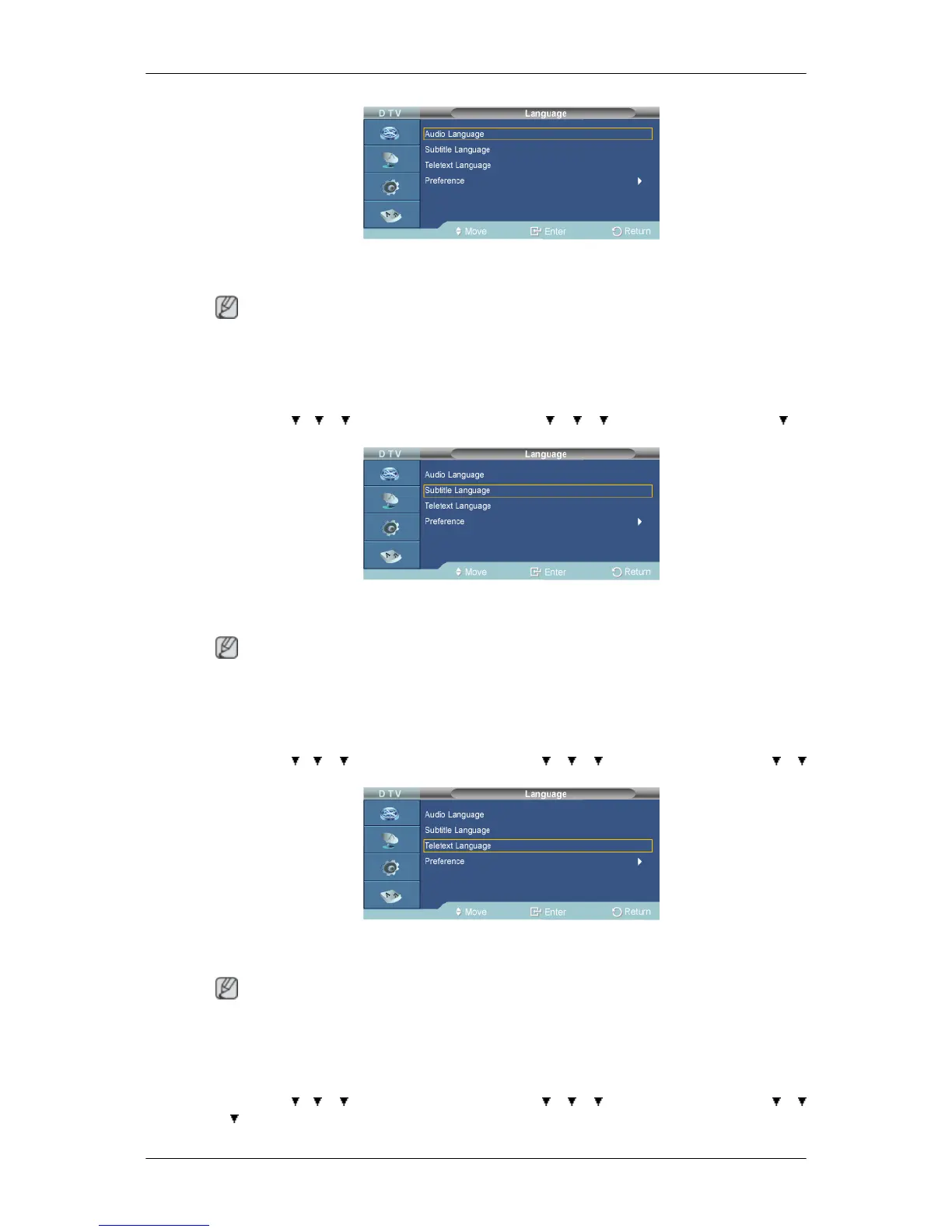 You can change the default value for subtitle, audio teletext languages. Displays the language infor-