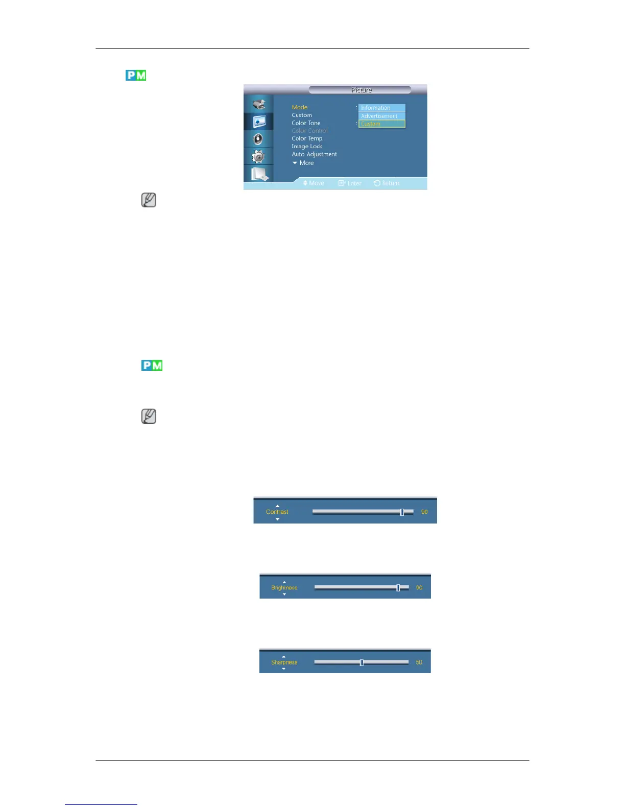 • By adjusting the picture using the Custom function, Mode will change to Custom mode.