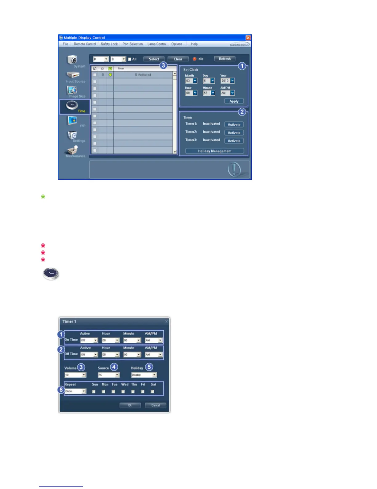 - Sets the time in hours, in minutes and as AM/PM for turning the selected monitor on.