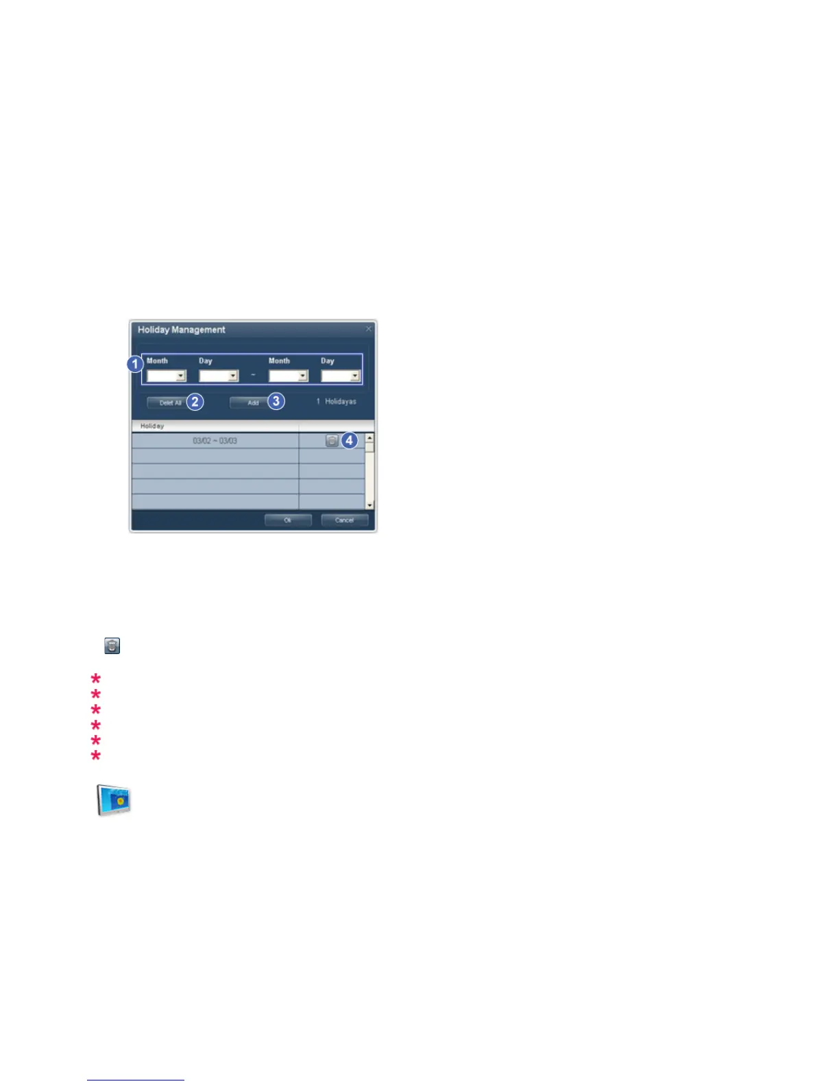 The Holiday Management function specifies the dates in which the monitor will not be turned on or off by the Timer.