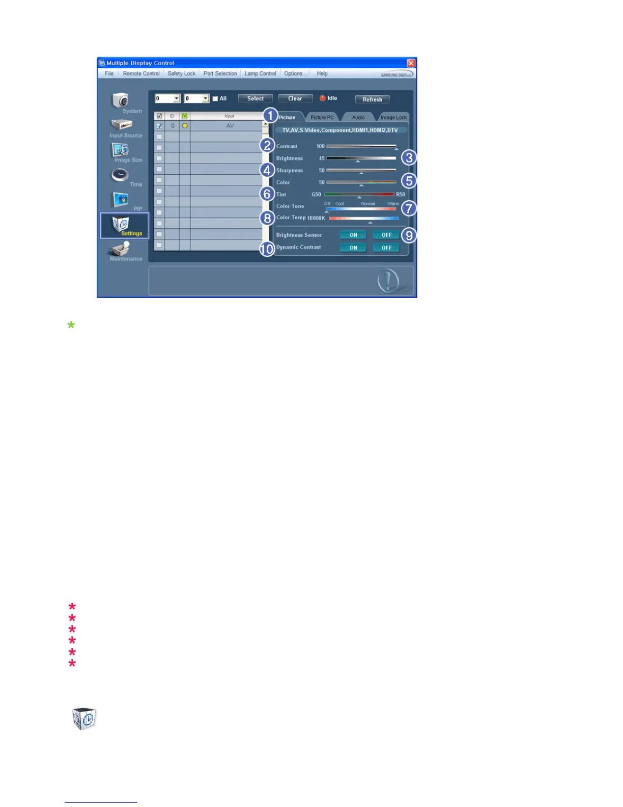 Basic information required to adjust the Picture is displayed in the main menu. Settings for the selected monitor will