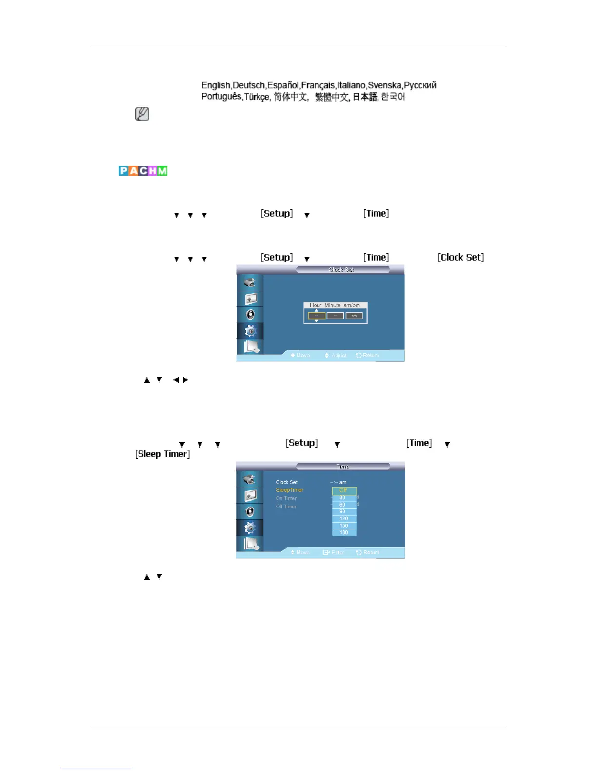 Selects from one of 4 time settings, Clock Set, Sleep Timer, On Timer, and Off Timer.