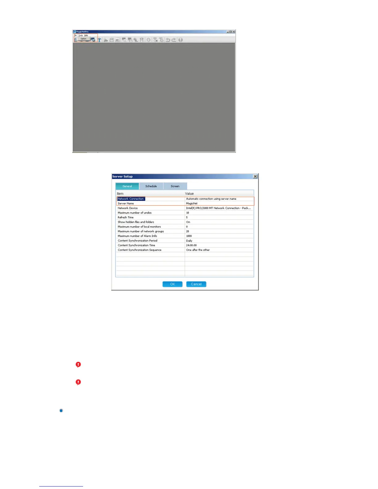 1. Set the source of the monitor to MagicNet and then enter the IP address and server name using the