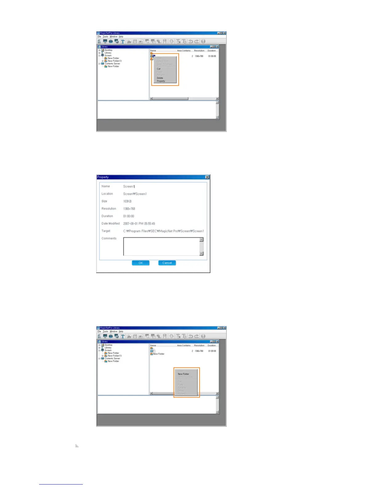 Delete: Deletes the selected screen files and folders. However, if the selection includes