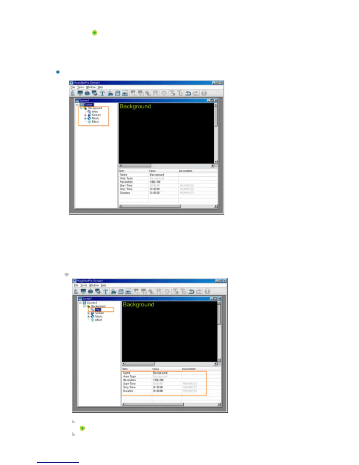 This is for configuring the background for all screens. The background consists of the Area,