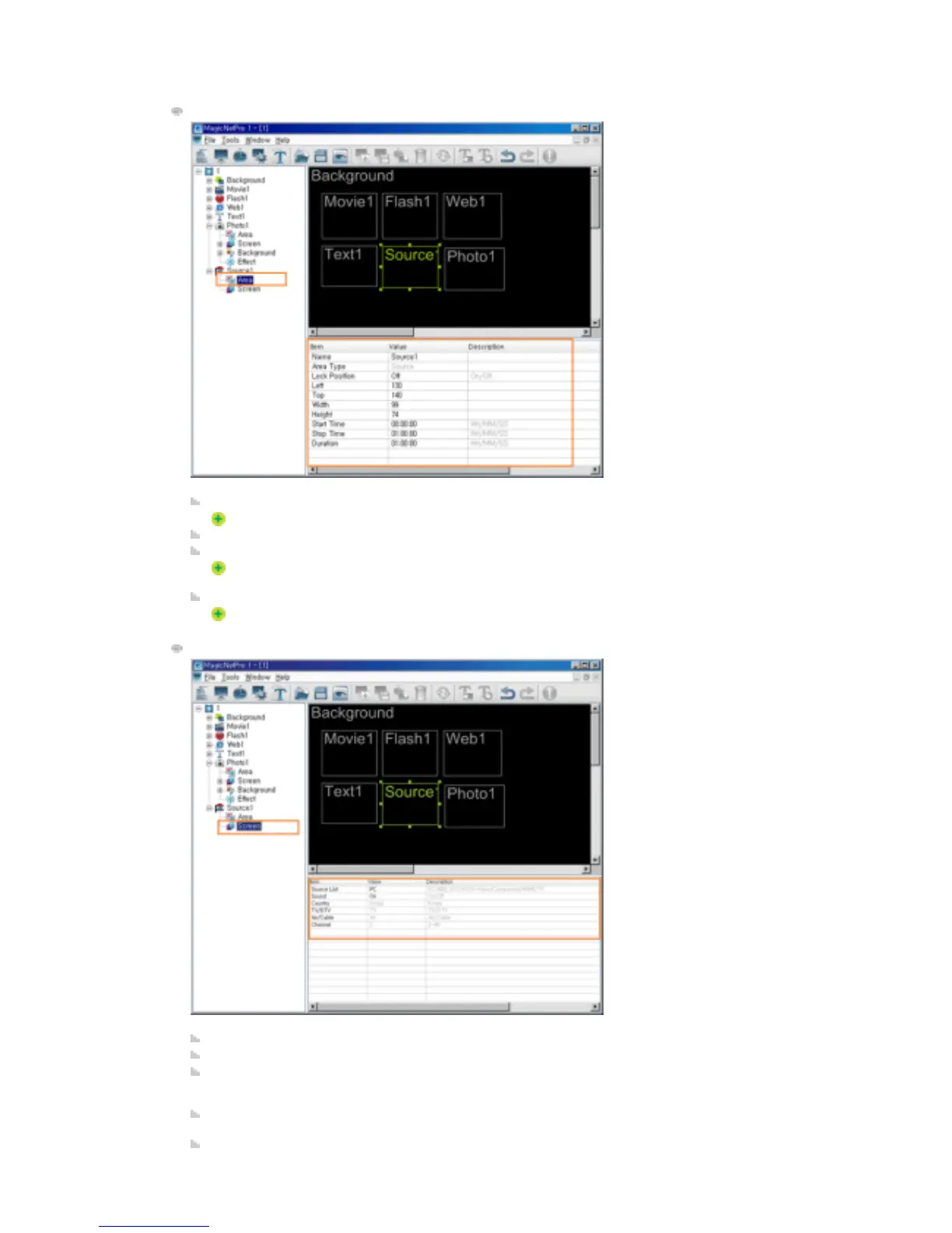 Source List: Selects the source to be played in the Source area.