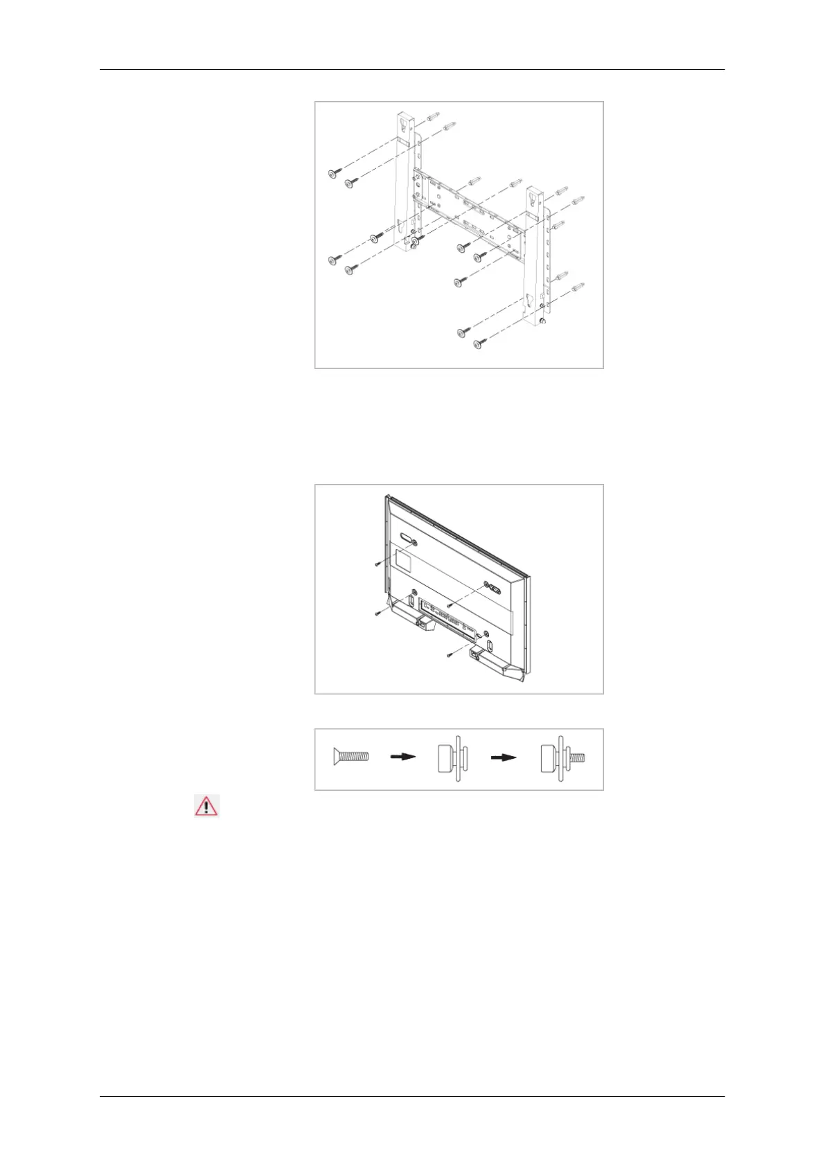 3. Tighten the 4 screws in step 2 (plastic hanger + screw B)to the rear holes of the product.