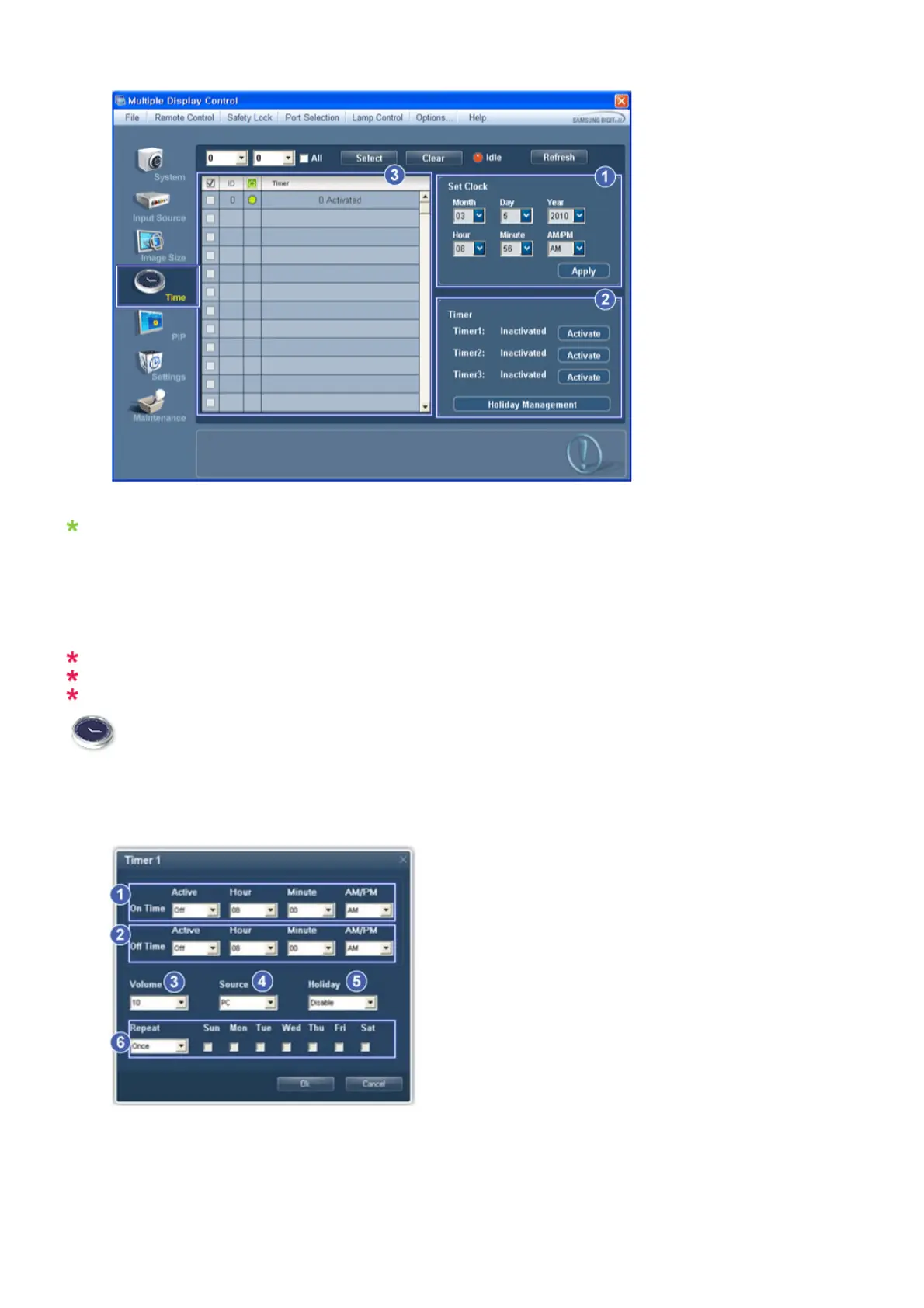 - Sets the time in hours, in minutes and as AM/PM for turning the selected monitor on.
