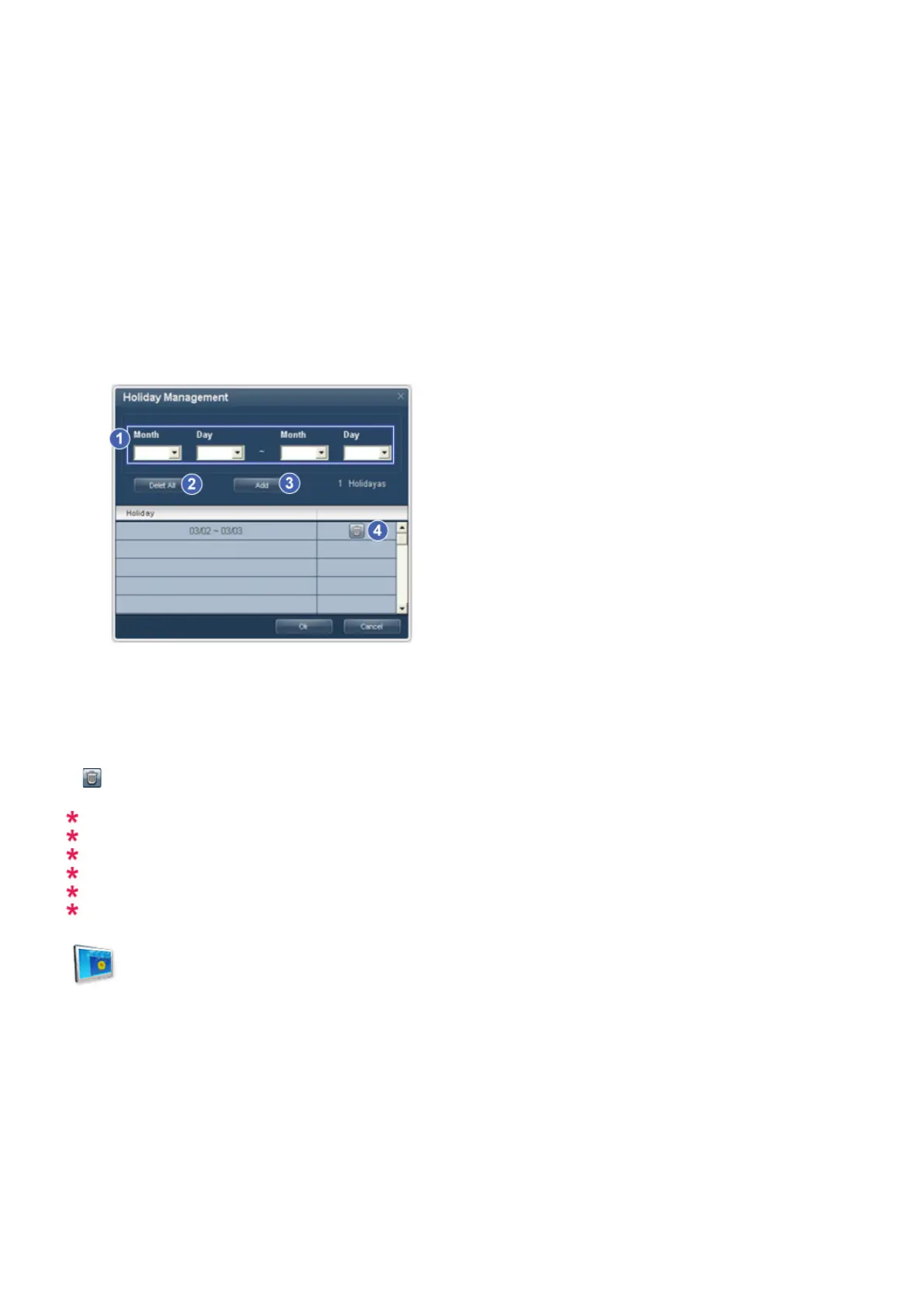The Holiday Management function specifies the dates in which the monitor will not be turned on or off by the Timer.