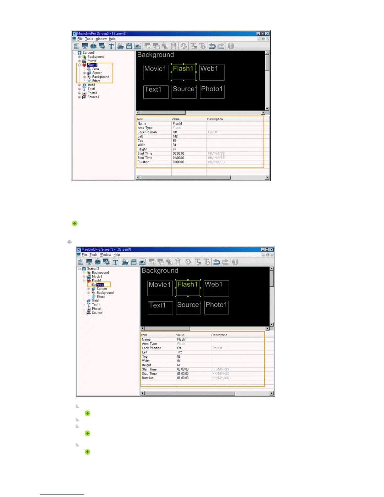 This function is for configuring screens using Macromedia flash files and consists of Area, Screen,