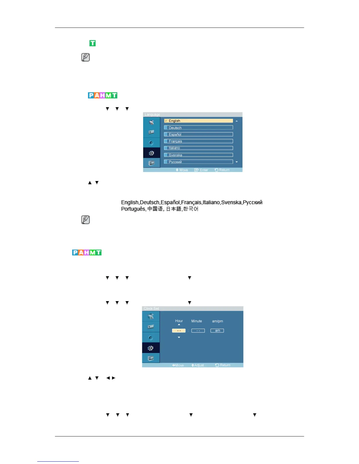 MENU → → → → ENTER → [Setup] → → ENTER → [Time ] → ENTER→ [Clock Set]