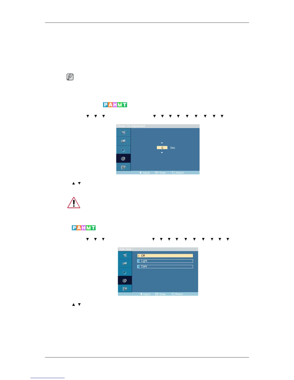 Adjusts the Power On time for the screen.