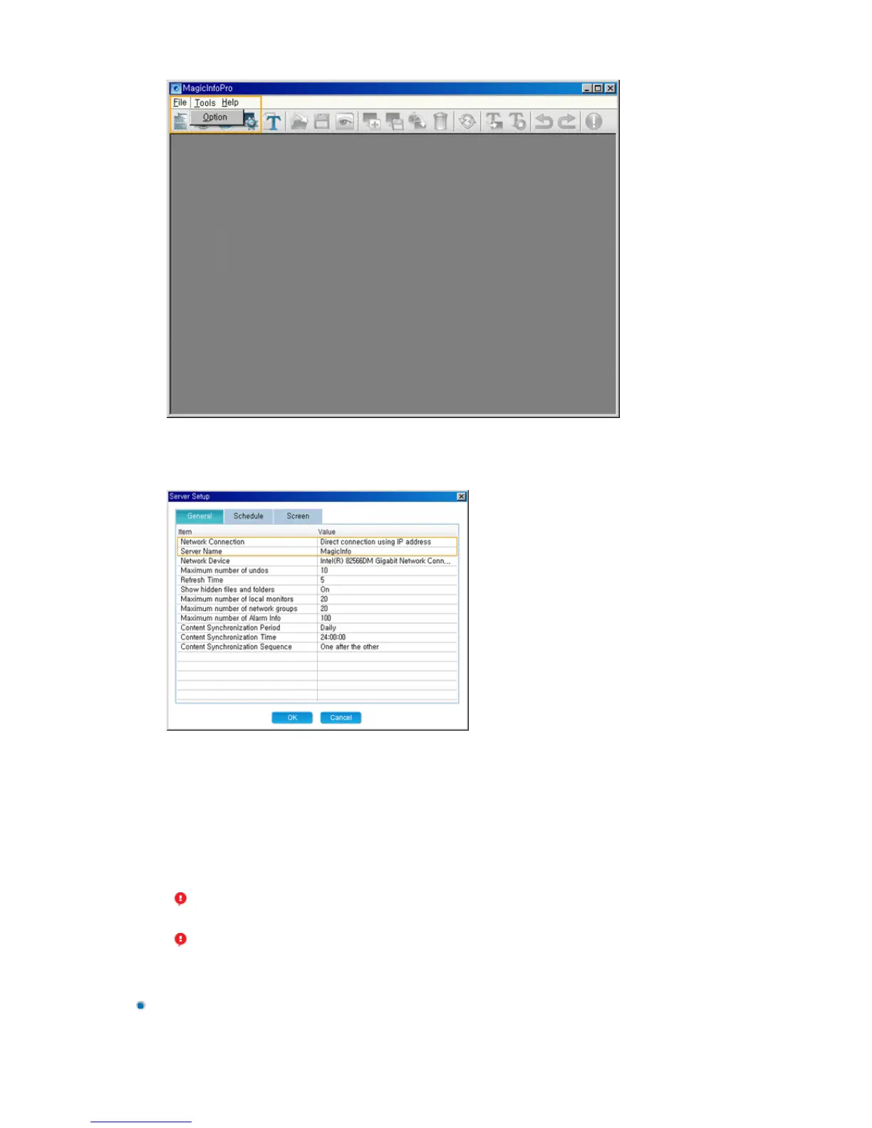 1. Set the source of the monitor to MagicInfo Pro and then enter the IP address and server name using