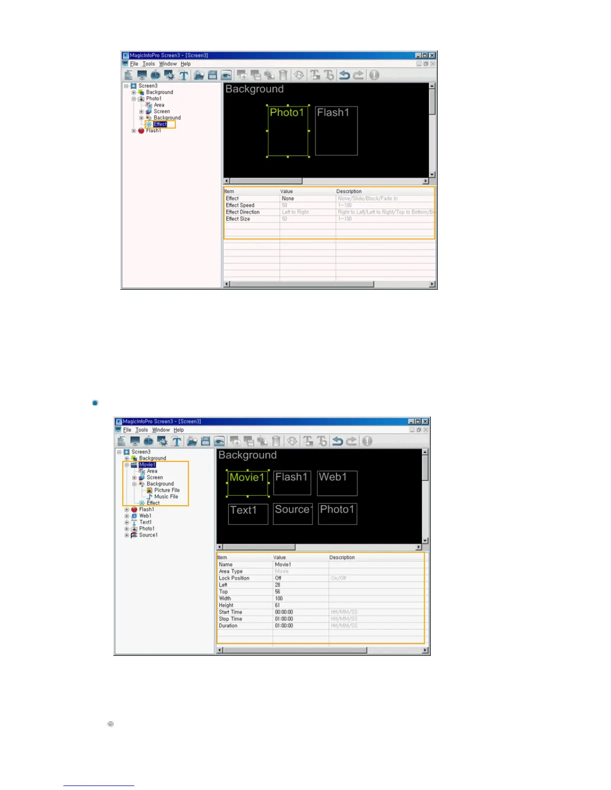 This function is for configuring screens using movie files and consists of Area, Screen, Background,