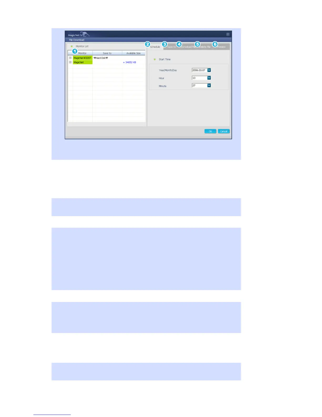 2) Allows you to set the time for downloading files to the monitor or deleting files.